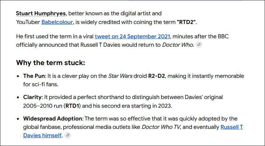 My 2009 YouTube video 'The Doctor Who Misinformation Guide' lays claim to a little piece of popular culture... The video was recommended in Doctor Who Magazine issue 431 and SFX Magazine issue 188, and has since passed 100,000 views on YouTube. Within it, I coined the term "RTD2" in reference to the then Doctor Who showrunner Russell T Davies. This tag gained wider usage in 2021 when Doctor Who fandon adopted it to differentiated Russell's second tenure on the show from his original run between 2005-2010.